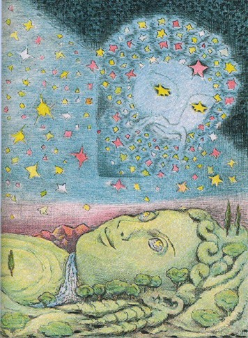 Ich fand es vor Jahren in einer Astro-Zeitschrift und bin vor kurzem nochmals auf einer italienischen Webseite darauf gestossen, habe nach dem Künstler/der Künstlerin gefragt, aber leider wusste niemand bescheid. Sollte sich jemand daran stossen, dass es nun dieses Farbenblog schmückt - bitte melden! Könnte aber durchaus auch als Hommage empfunden werden - und ist es auch!