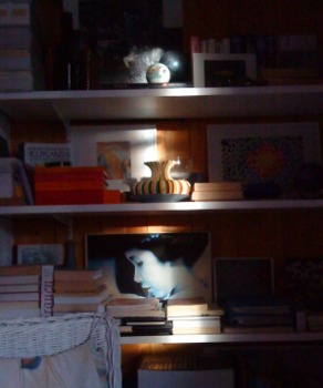Gerade streift auf dem Bild die Morgensonne ein Lieblingsmotiv auf meinem Bücherregal, welches sich zumeist als erstes in das Blickfeld schiebt, wenn sich die Augen mal kurz öffnen, um sich dann nochmals für ein Weilchen zu verschliessen...
